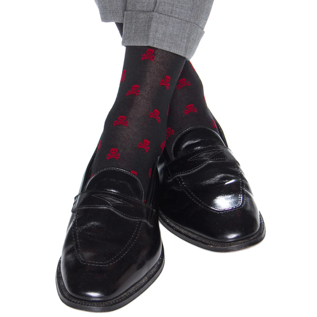 Dapper Classics Skull and Crossbones Merino Wool Sock Linked Toe Mid-Calf in Black/Red