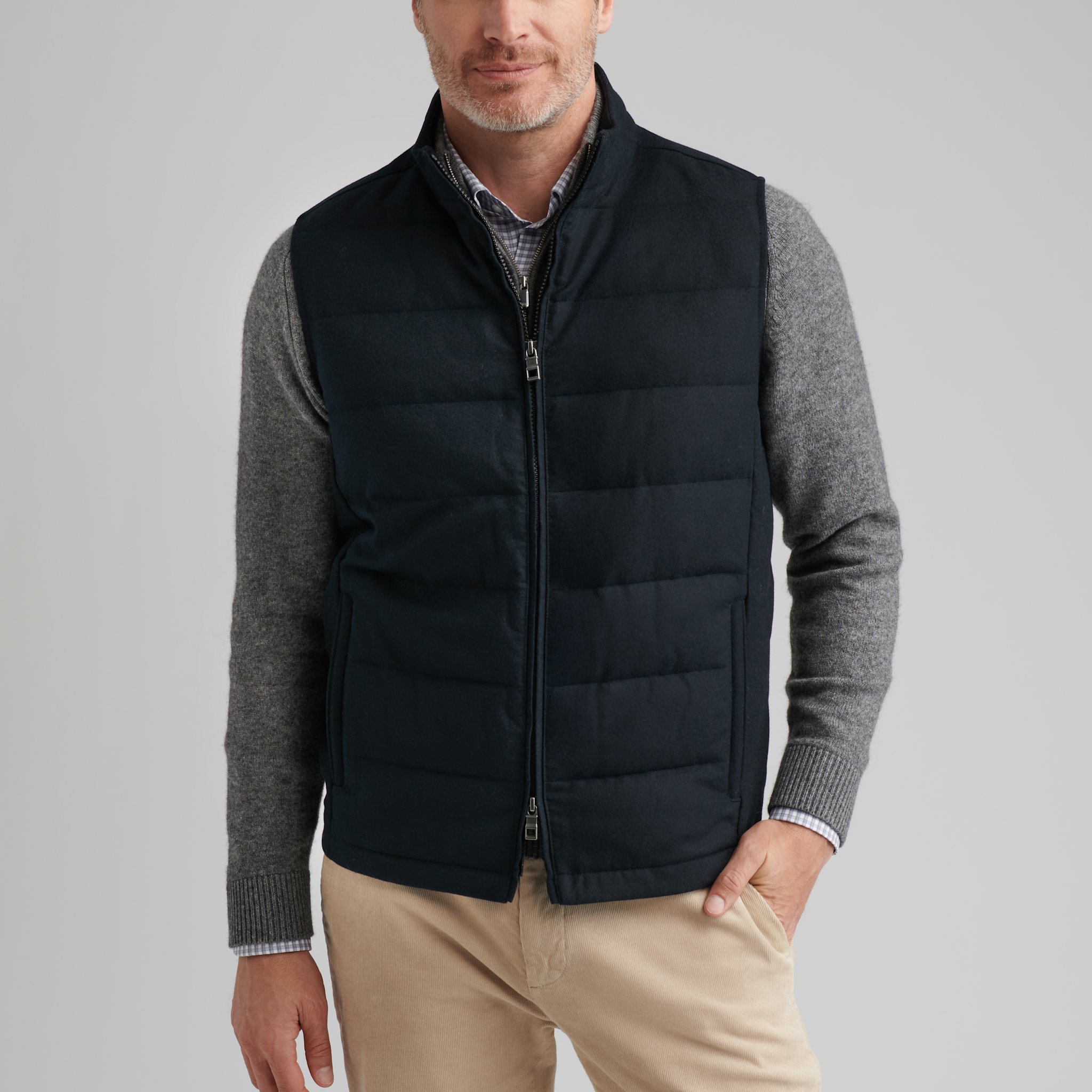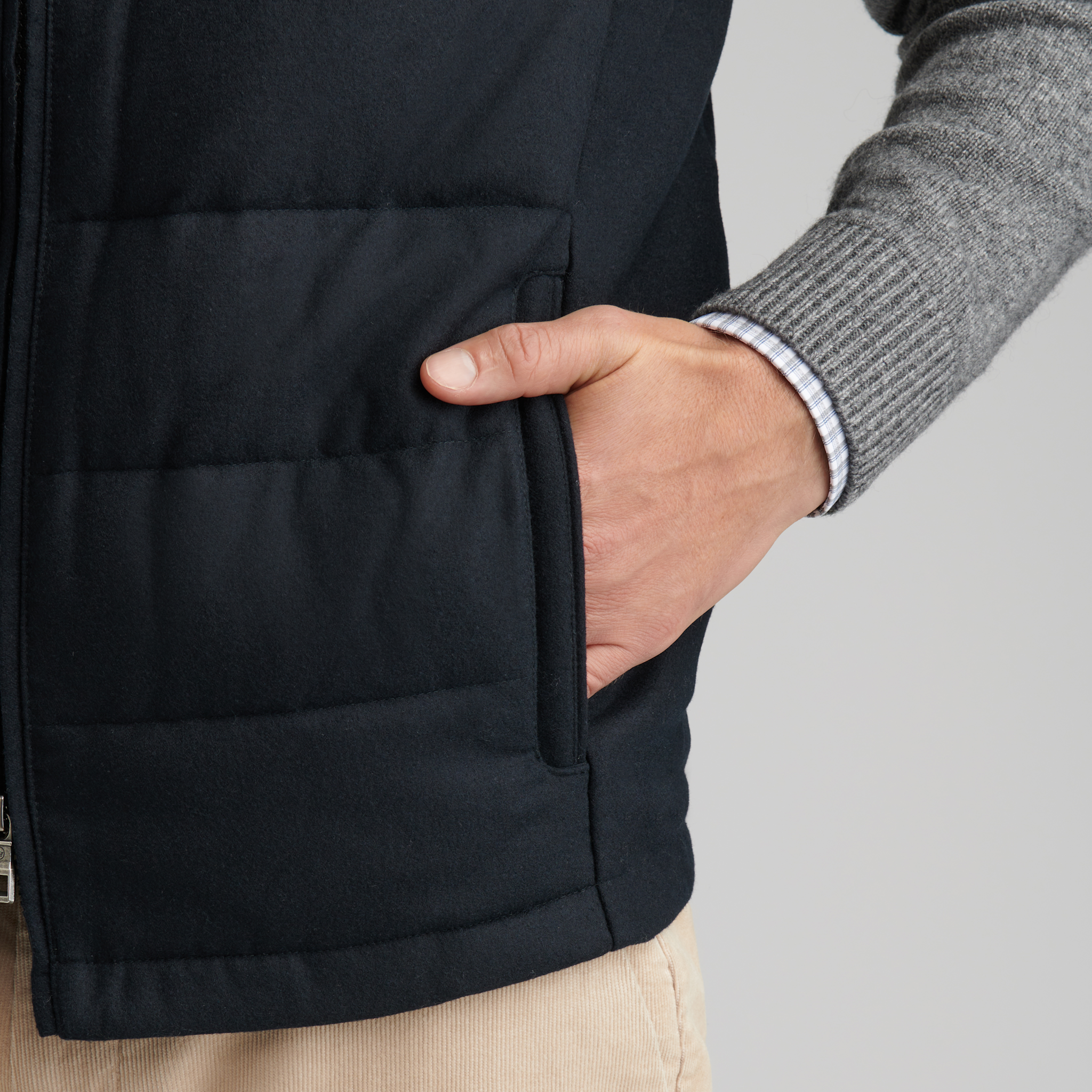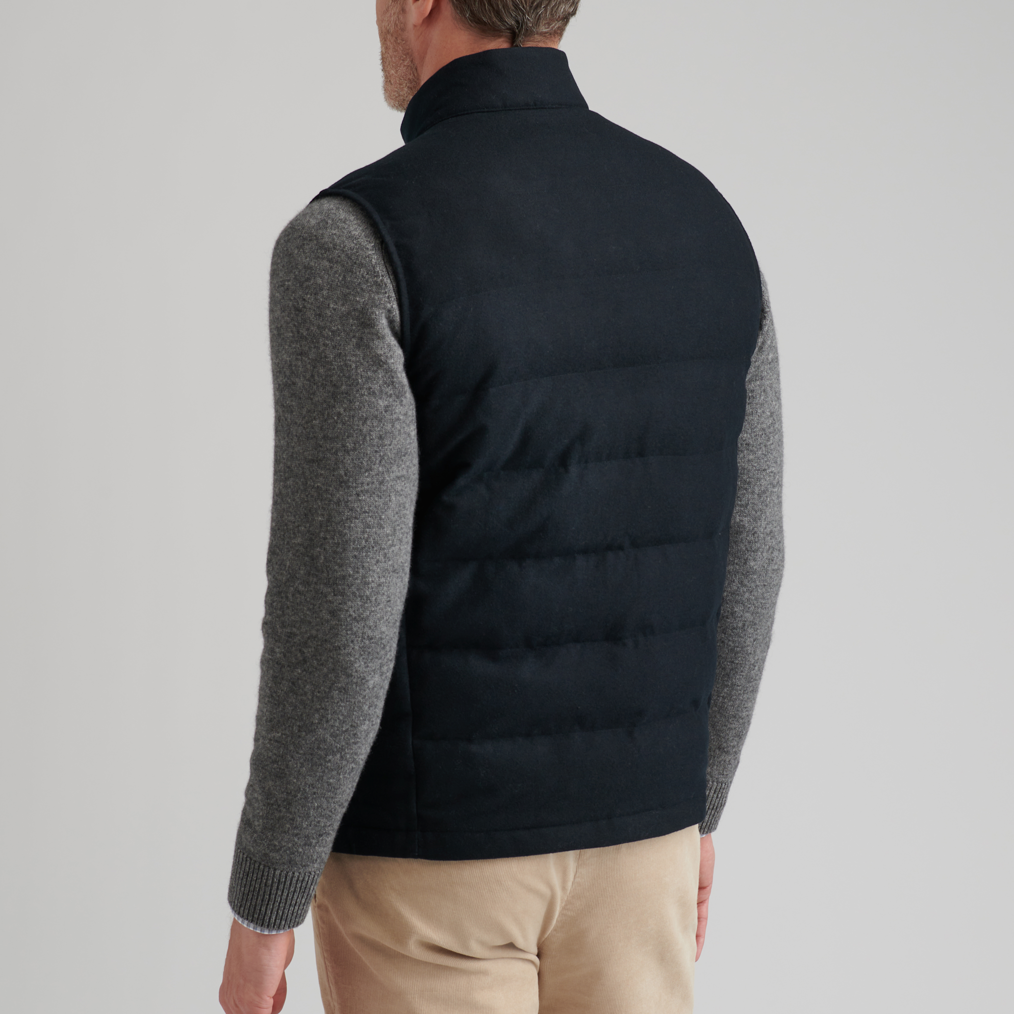 This streamlined channel quilted vest is designed for versatile cool-weather wear. Crafted with luxurious Italian wool and pillowy soft down-alternative insulation for superior comfort and casual yet sophisticated design. Finished with a two-way zip closure.
