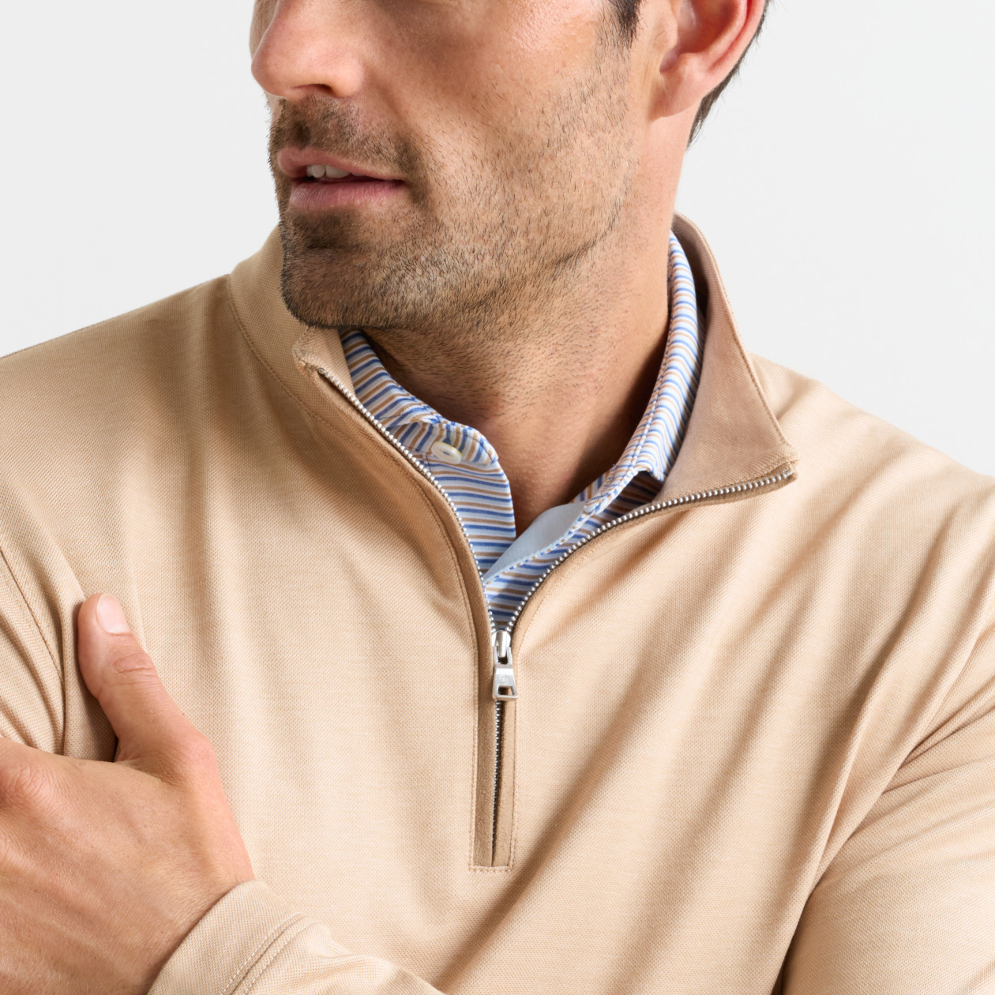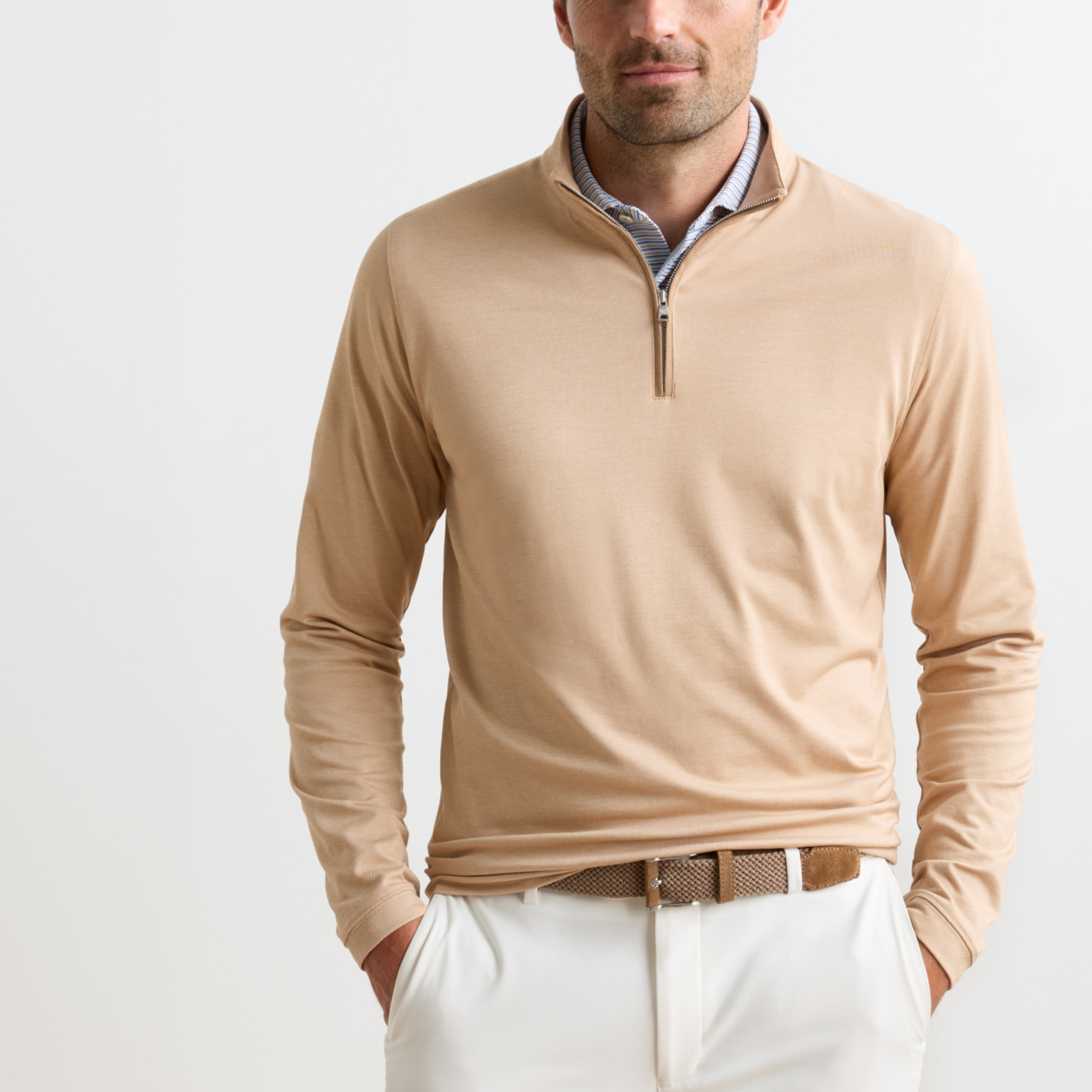 This lightweight quarter-zip styles like a sweater and plays like performance apparel for incredibly versatile wear. Leveraging a textured piqué fabric similar to our Albatross Polos, it offers a classic look, softness and stretch comfort. Finished with suede-like accents on the placket and interior collar.