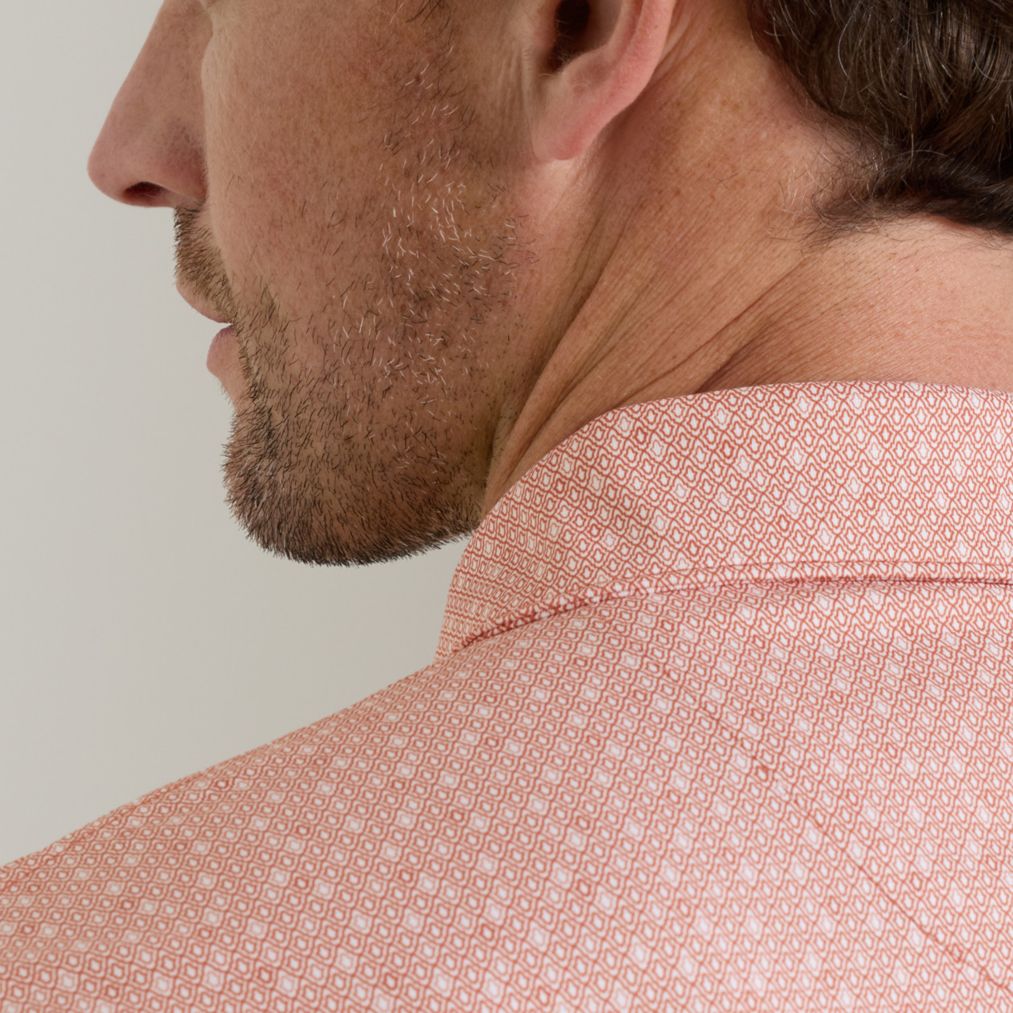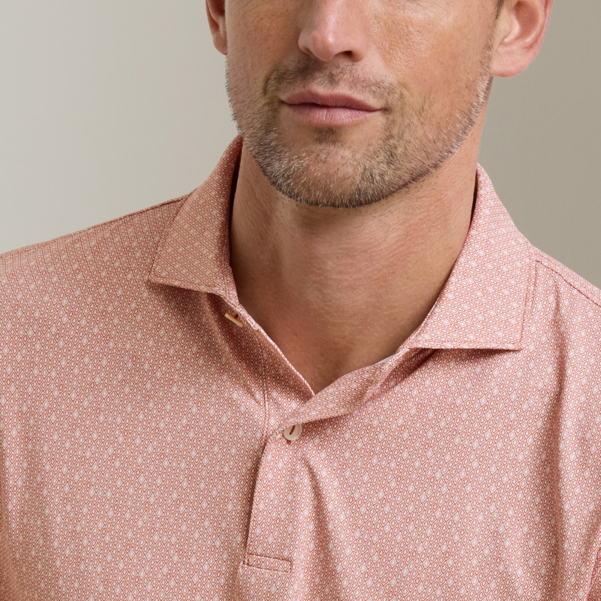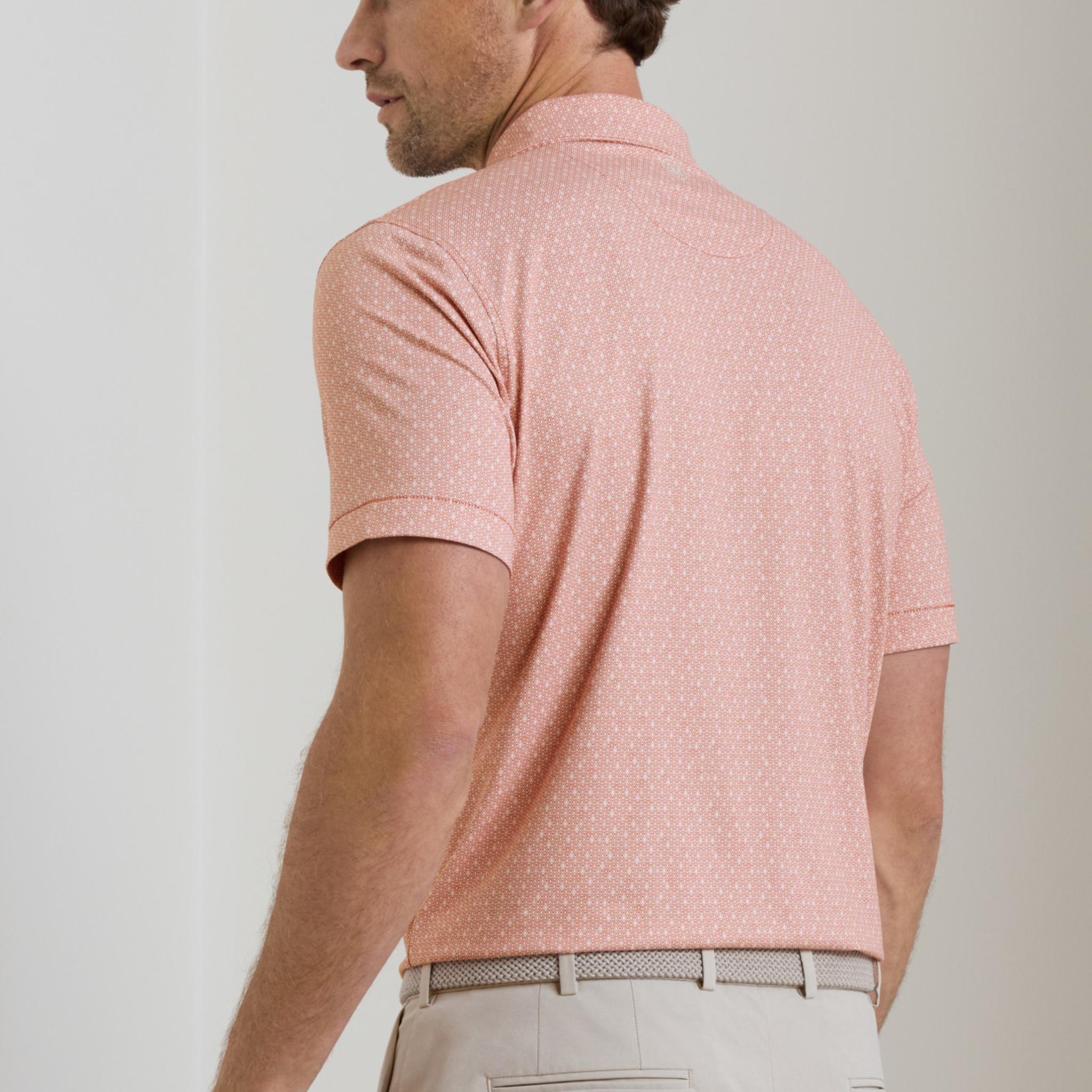 With clean style and exceptional comfort, our Crown Crafted jersey polos bring a soft, plush feel with wicking, four-way stretch, easy-care and UPF 50+ sun protection. This shirt features a custom-designed geometric print for added style. Finished with a spread collar and detailed with mother-of-pearl buttons.