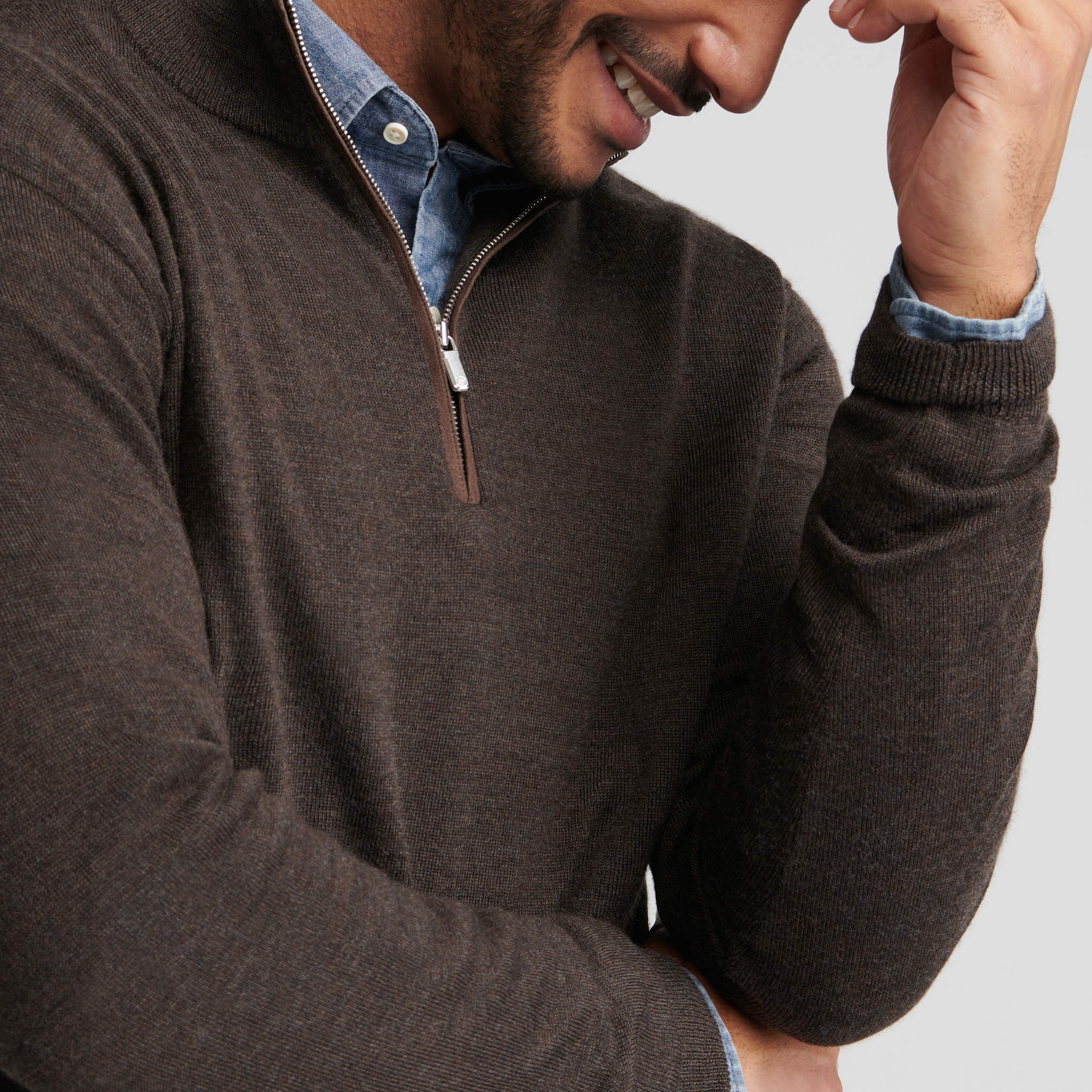 This lightweight sweater is knit from a signature blend of Merino and lyocell. Incredibly soft and breathable, this essential style is designed to maintain its shape after each wear. Features suede trim along the zipper for an elevated look.