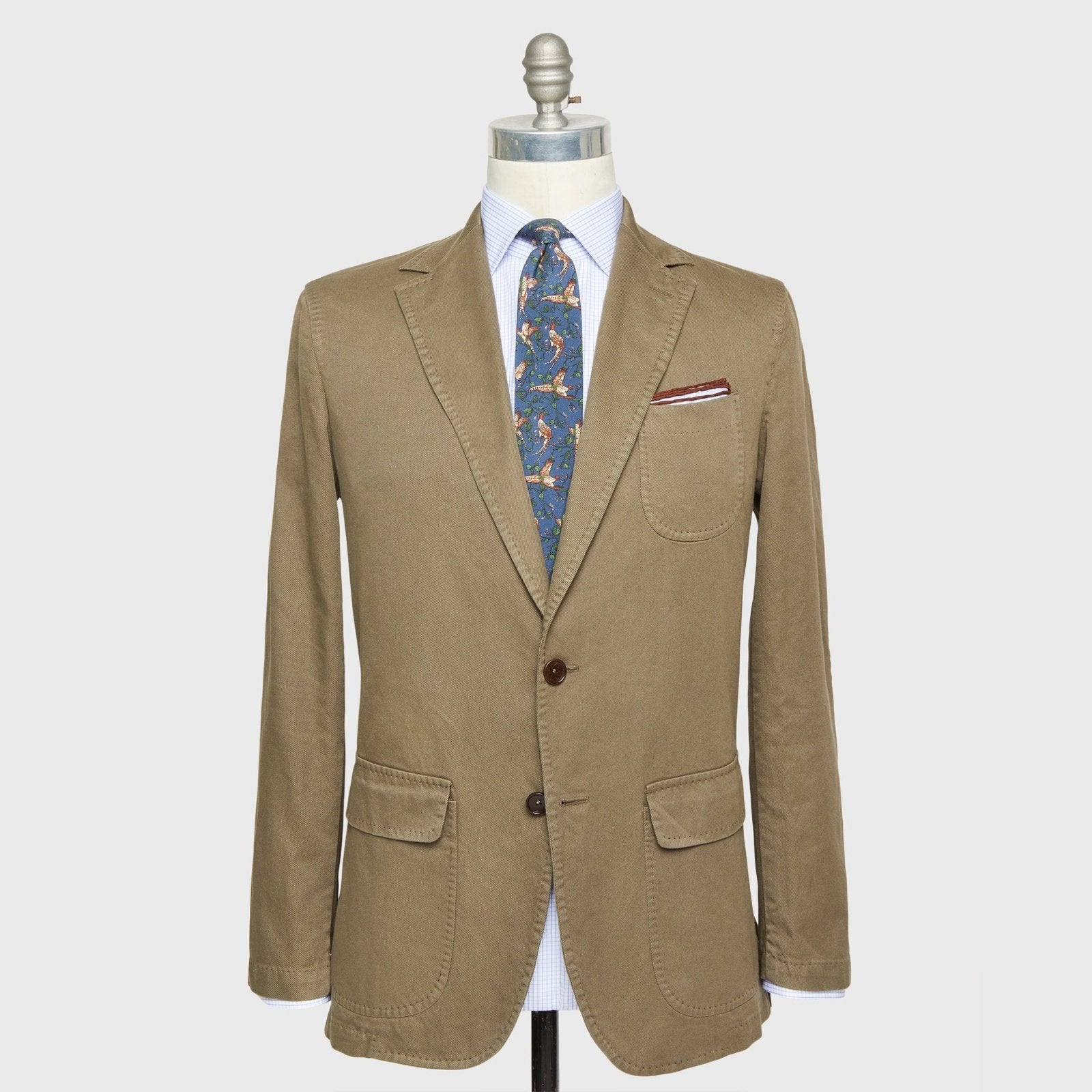 Somewhere between a chore coat and a blazer, the Butcher might be the easiest jacket we make. This one's made from high ridge cotton twill — one of our favorite fabrics — which is slightly rugged with a dry hand and a great tooth to it. A natural complement to a casual jacket shape. It's unlined and unconstructed, with a natural shoulder and pickstitched spalla camicia shirtsleeve construction. The pockets on the front are special, too: we designed them so that you can tuck in the flaps (without looking like you just tucked in the flaps) for a more open look. There are even reinforced elbow patches to really drive the “casual” thing home. The fit of the Butcher is easy, with a touch more room in the body than our tailored jackets. And while it looks great with a polo or sneakers, you can also dress it up like a true blazer.