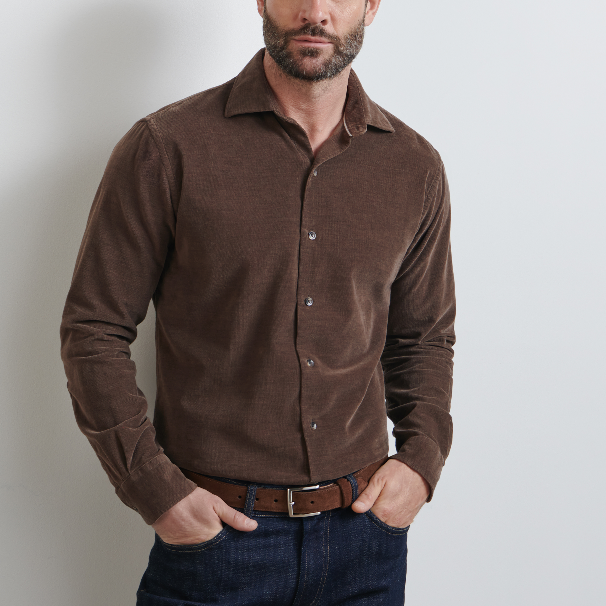 This sport shirt is made from an exceptionally soft blend of cotton and cashmere with a corduroy texture for effortless cool-weather style. A soft spread collar provides a refined casual look.