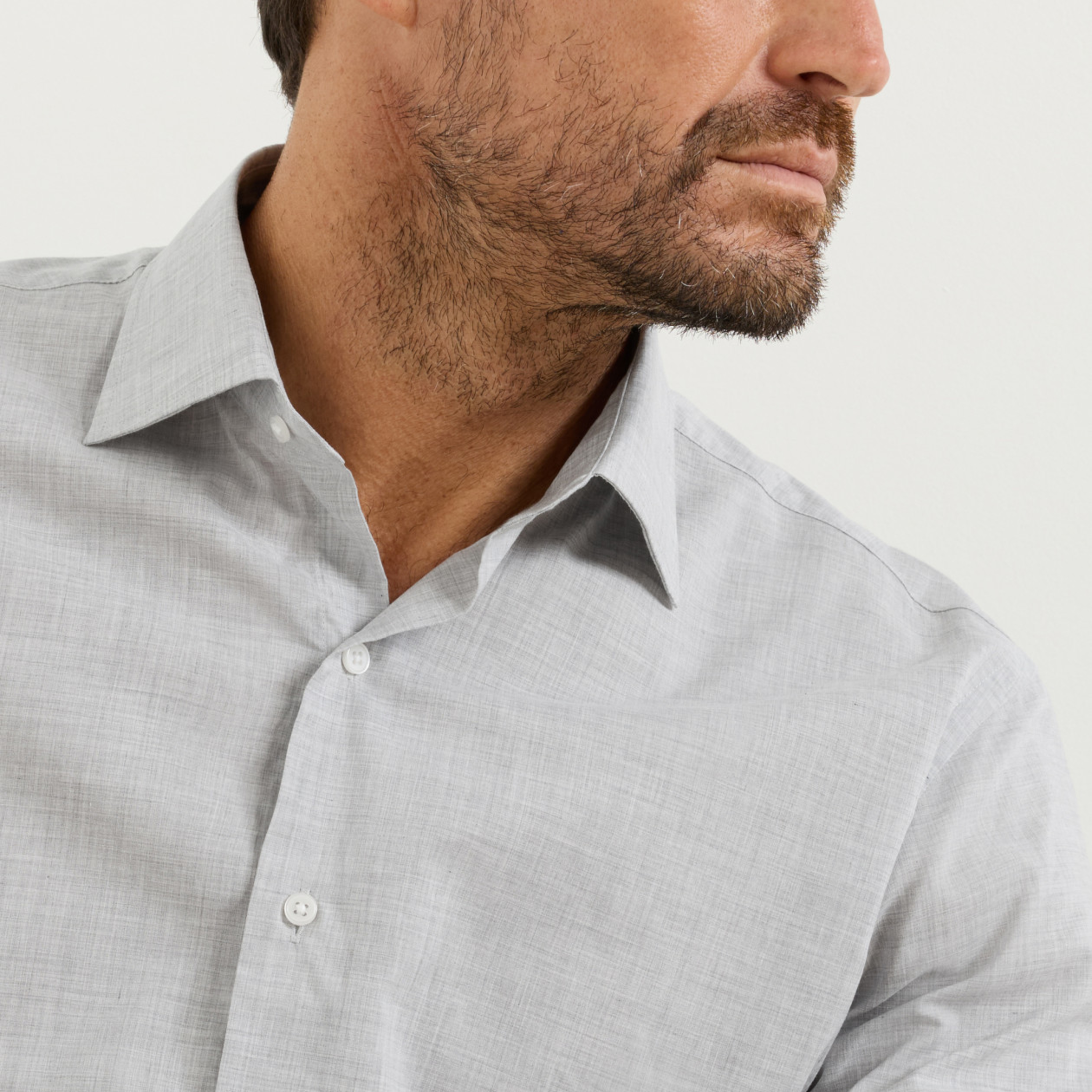 - Spread collar, French placket, double-button barrel cuffs