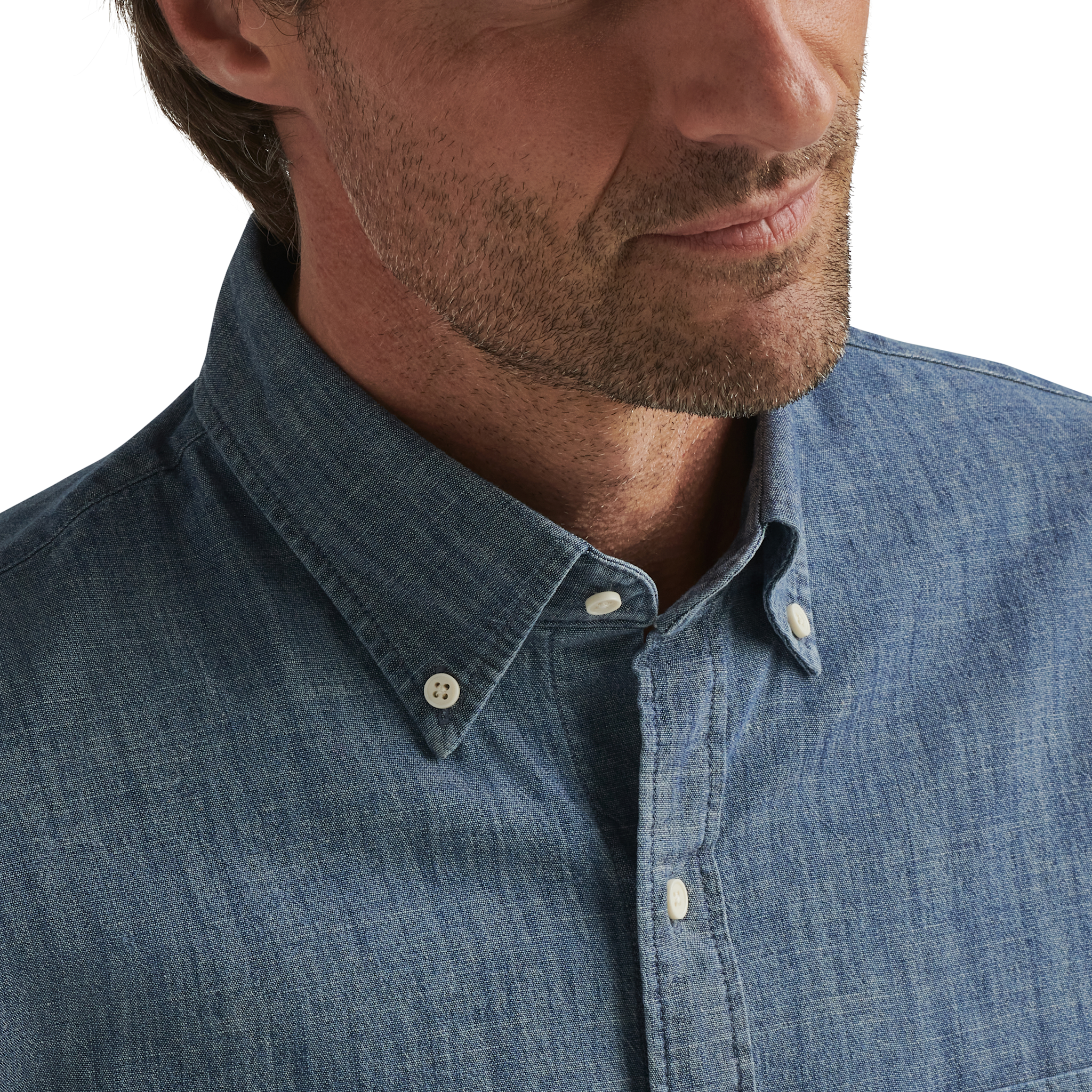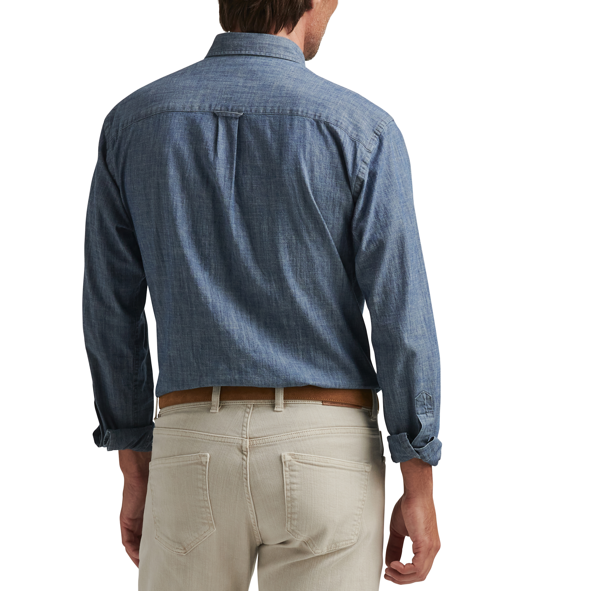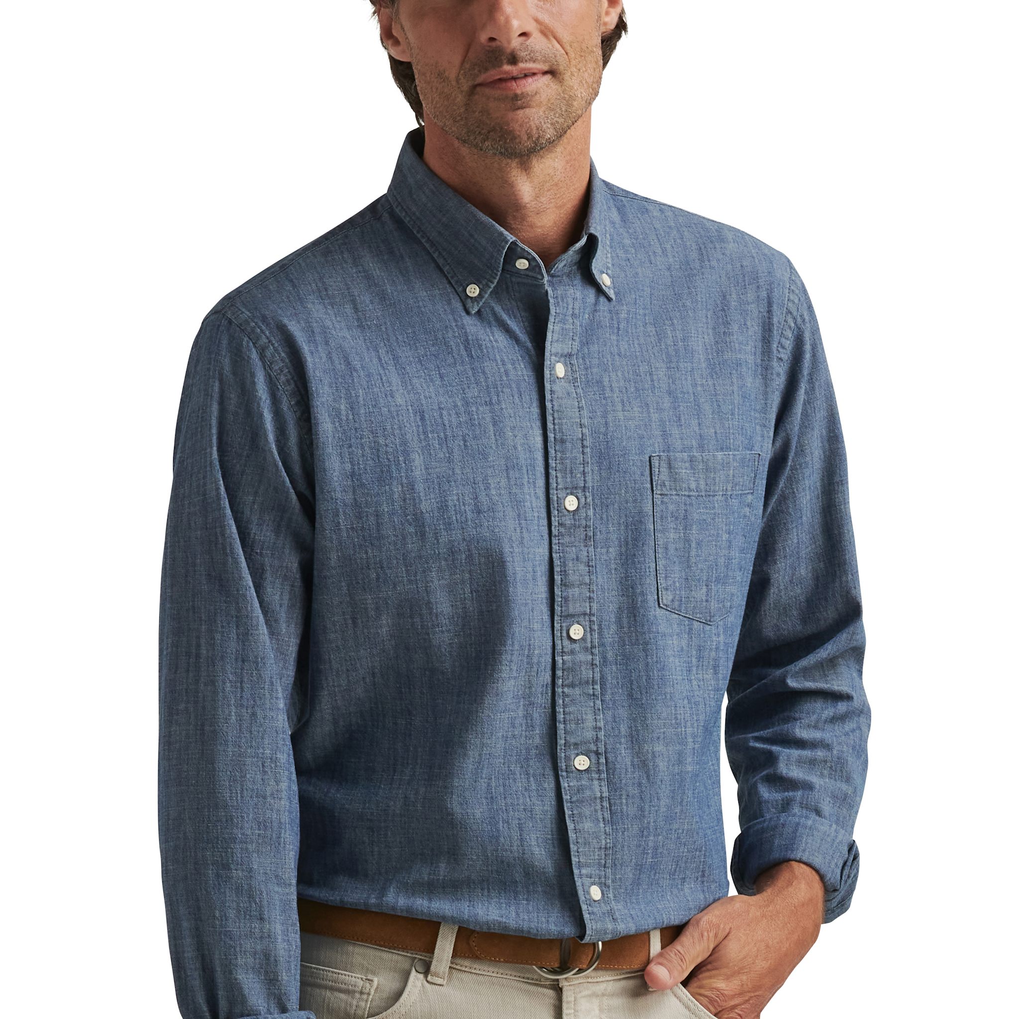 This chambray shirt is made from soft cotton, with a hint of stretch for comfort. It features a washed, lived-in quality for an easygoing appearance and classic casual style. Finished with a button-down collar, chest pocket and double-button barrel cuffs.