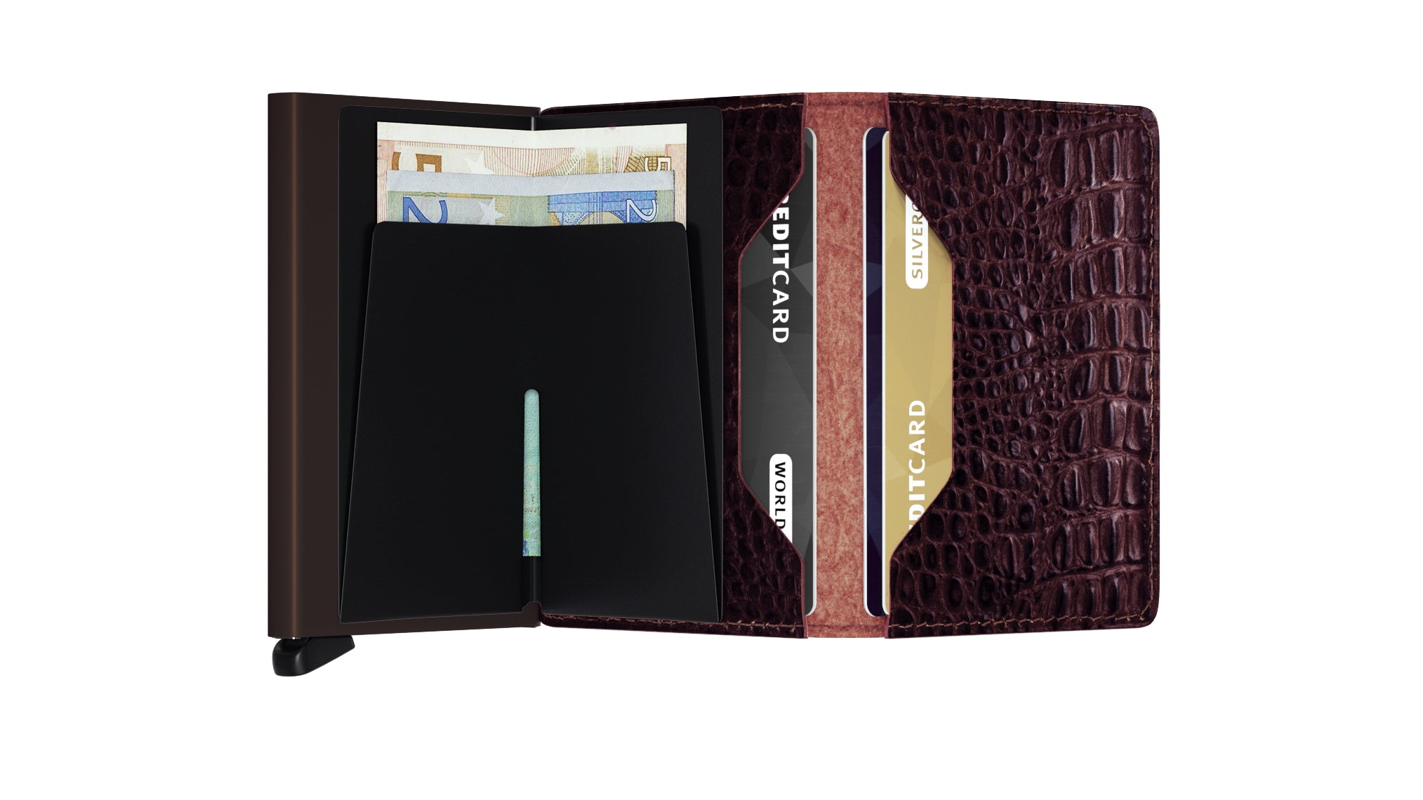 The Slimwallet Nile is high-quality croc, made from cowhide. The embossing has a deep rich multitoned colour which is achieved with a special tamponato technique and hand finished with a high gloss.