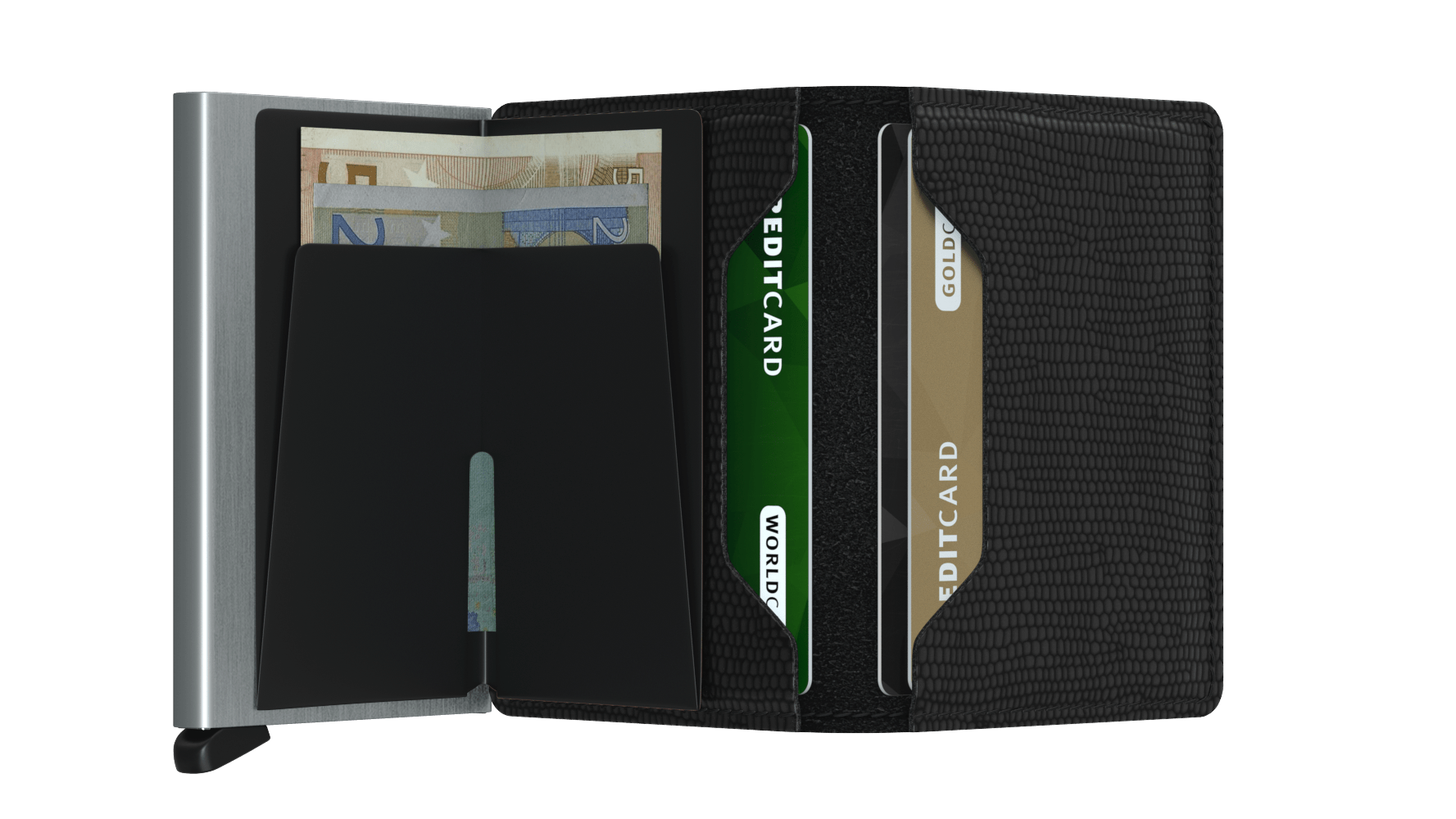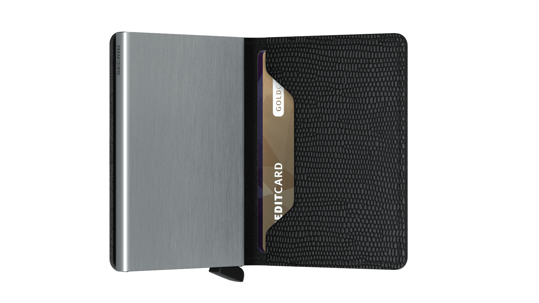 The patented mechanism allows you to slide out your cards with one simple motion, ready for immediate use. The aluminium protects from bending, breaking and unwanted wireless communication.